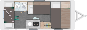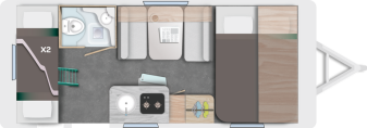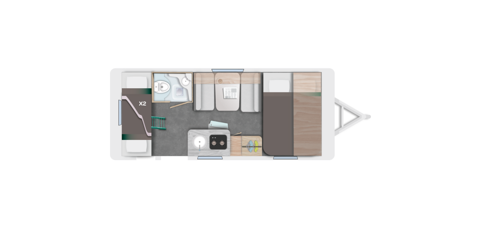 De Caravelair Alba 486 family is een ruime, licht gewicht caravan voor 2 volwassenen en 2 tot 4 kinderen. Met een dwars geplaatst vast bed voorin, middenkeuken, een dinette die omgetoverd kan worden in 2 slaapplekken (110 x 170 cm), een toiletruimte voorzien van vast toilet en hoek wasbakje en een vast stapelbed in de breedte achterin.