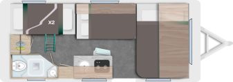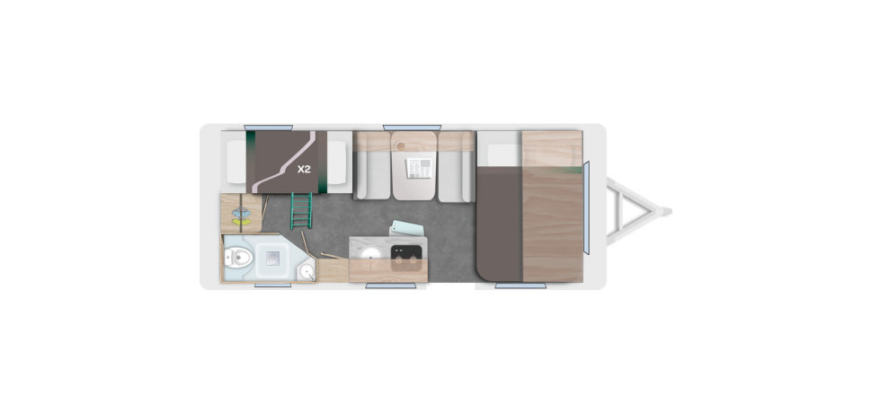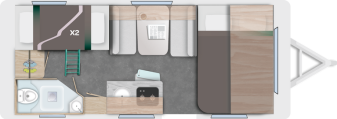 De Caravelair Alba 496 family is een ruime, licht gewicht caravan voor 2 volwassenen en 2 tot 4 kinderen. Met een dwars geplaatst vast bed voorin, middenkeuken, een dinette die omgetoverd kan worden in 2 slaapplekken (110 x 170 cm), achterin een toiletruimte voorzien van vast toilet en hoek wasbak en een vast stapelbed in de lengte achterin.
