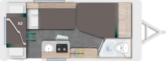 De Caravelair Sport-Line 476 is een ruime caravan met een vast bed voorin, midden-dinette, toiletruimte met vast toilet naast het frans bed, middenkeuken en achterin een stapelbed.