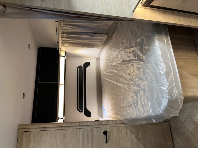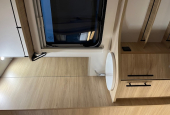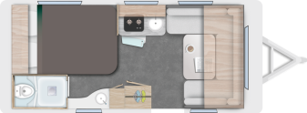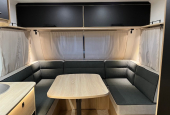 De Caravelair Sport Line 455 is een ruime caravan met een vast bed achterin, toiletruimte met vast toilet naast het vaste bed, middenkeuken en voorin een ruime rondzit.