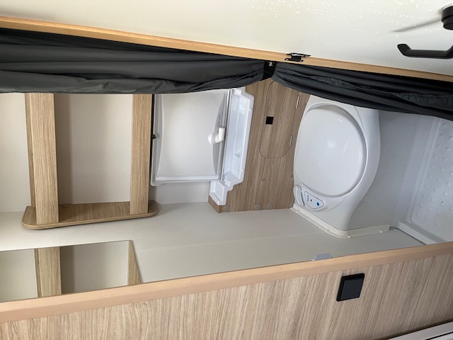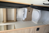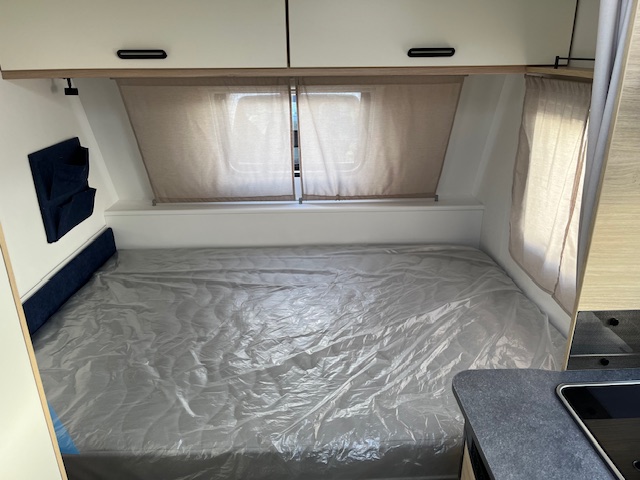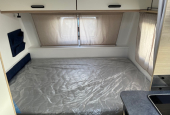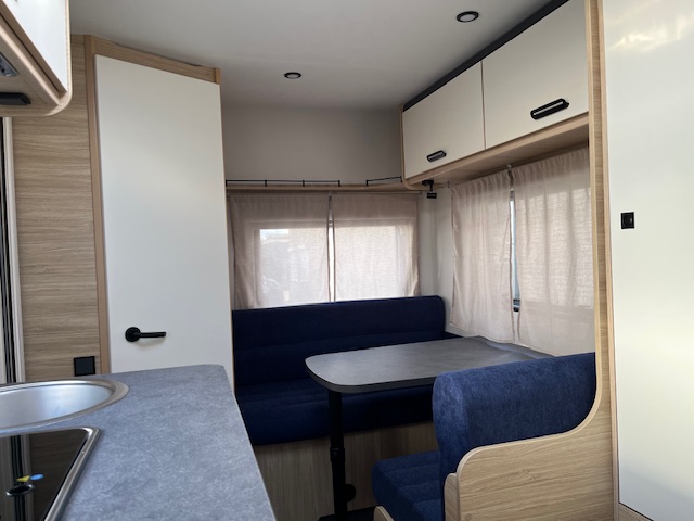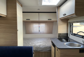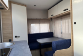 De Caravelair Alba 390 is een compacte caravan voor 2 volwassenen (en eventueel 2 kinderen). Met een groot dwars geplaatst vast bed voorin en achterin een treinzit die omgetoverd kan worden in 2 slaapplekken (90/125 x 190 cm). Middenkeuken. Links naast de deur een toiletruimte met vast toilet en opklapbare wastafel.